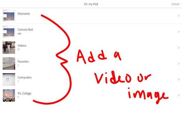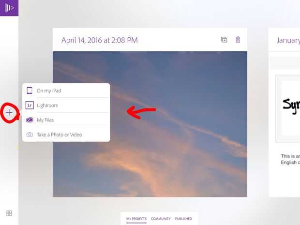 Una vez que se abre seleccione Adobe Clip el signo más (+) y seleccione toma una foto o un vídeo o en el iPad.