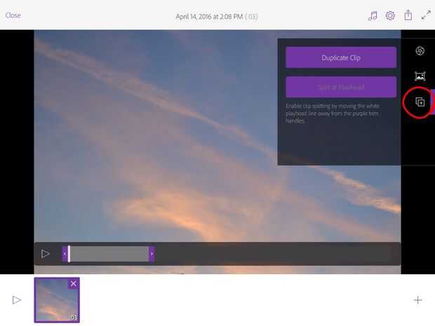La plaza con el signo de más en el centro le dará la opción de duplicar clip y dividir un clip.