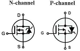 La imagen siguiente muestra los dos tipos de símbolos de esquemas asociados con MOSFETs. (Cabe señalar aquí que los esquemas que se muestran son solamente para el tipo de realce MOSFETs. También hay tipo de agotamiento, y la diferencia es que mejora "activar" cuando se aplica voltaje, mientras que el tipo de agotamiento "desactivar". Trataremos solamente con tipos de mejora aquí.) Los tres pasadores están etiquetados Gcomió, lluvia Dy Source. (FYI - para BJT, éstos están etiquetados como Base, ollector Cy Emitter y sirven las mismas funciones básicas). Observe detenidamente la orientación de los tres pernos. Es muy fácil cambiar el MOSFET por atrás, así que siempre verifique su pajina para el MOSFET se utiliza para asegurar la orientación correcta del perno. El ZVNs y el ZVPs que estoy usando tienen una orientación pin diferentes que la mayoría de los MOSFETs que utilizan el paquete TO-220.