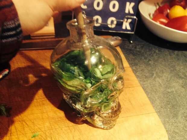 Utilice el extremo posterior de una cuchara de madera para embalar la albahaca abajo en el vodka.