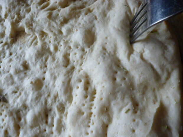 5. hornear durante cinco minutos en el estante inferior del horno. Con un tenedor, pinchar las burbujas que se han formado. Permitir que la corteza se enfríe lo suficiente para manejar – unos 5 minutos.