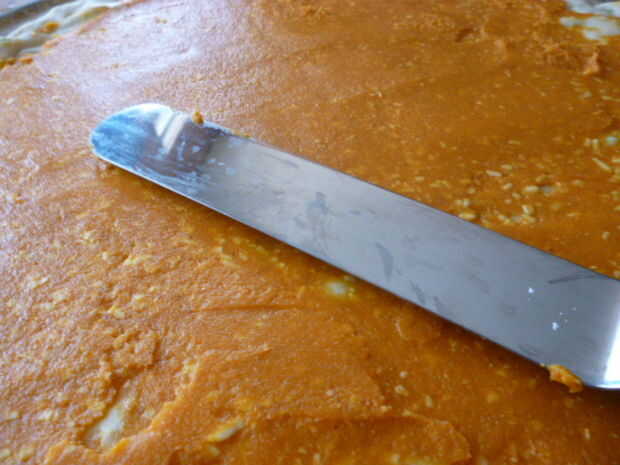 Repartidas uniformemente la mezcla de calabaza en la corteza y luego alisar con una espátula offset. Con la punta de un cuchillo de cocina, dibujar el contorno de una pelota de baloncesto en la superficie de la pizza. Presione el cebollino en el contorno, procurando que quede una poco saliente en los bordes, ya que el cebollino se reducirá durante la cocción. Hornear durante 15-20 minutos hasta que la corteza se dore ligeramente. Dar a todos una oportunidad de ooh y ah sobre tu trabajo y luego cortar en rodajas y sirva inmediatamente.