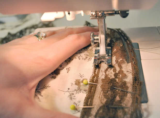 Usando una puntada corta y estrecha, coser el encaje toda la manera alrededor a lo largo del borde superior del cordón.