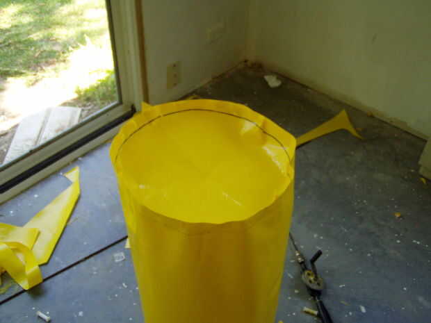 Cortar pequeños trozos de cinta de doble cara y pegue a su panel de base todo el margen de costura. Retire el papel de una sola pieza de la cinta y pegarlo a la costura correspondiente dentro del tubo. Recuerde que la bolsa es al revés en esta etapa, así que todas las costuras deben colgar hacia fuera.