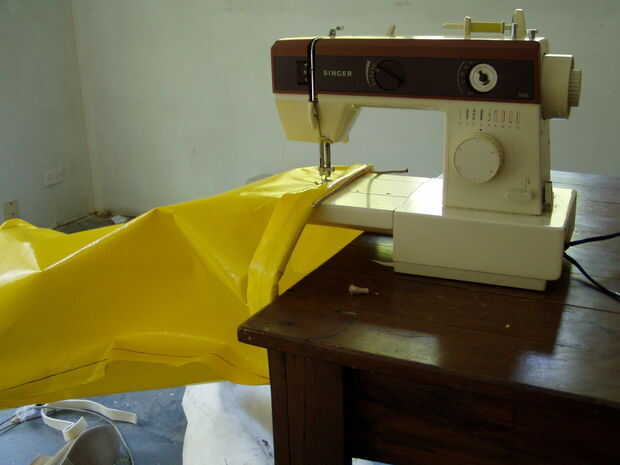 Ahora coser una hilera de puntadas a cerrar el dobladillo. Para este trabajo, es más fácil si usted puede colgar el extremo de la máquina hacia fuera sobre el borde de la mesa, dejando libre la boca de la caída de la bolsa. Una vez hecho esto se puede convertir el bolso exterior-out.