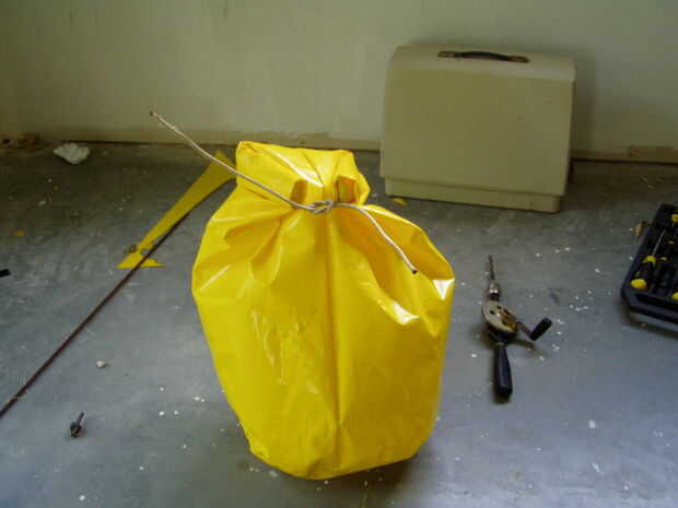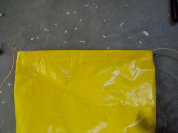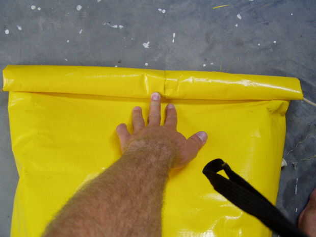 Doblar la boca de la bolsa plana, con el cordón de cierre colgando a cada extremo (Foto 1).