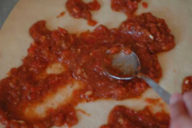 A continuación, extiende la salsa con una cuchara. No ponga demasiada salsa en, o el sabor va a superar todo lo demás.