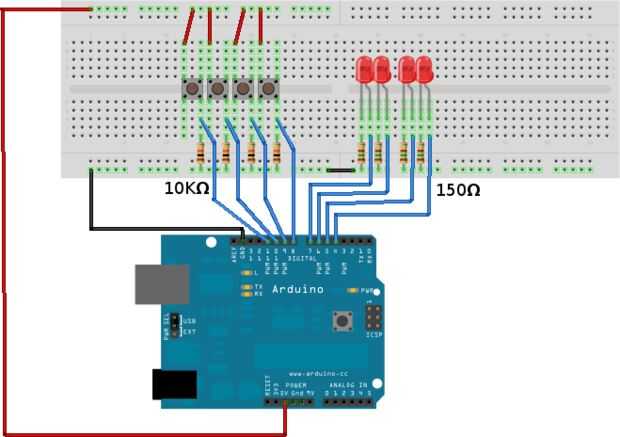 Si tienes un protoboard (un día voy a tener uno también), usted puede construir esta muy fácilmente. Vea el siguiente diagrama de Fritzing . Es un simple tablero con 4 leds y 4 interruptores normalmente cerrados (cada led va a través de una resistencia de 150 Ohm y cada interruptor tiene una resistencia de pull-up de 10K Ohm conexión entre la salida y la tierra).