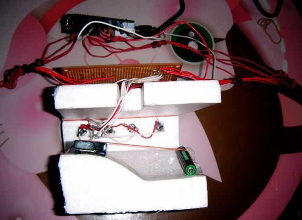 El "chasis" se hace de un pedazo de espuma de poliestireno de algún paquete. Fue fácil crear los orificios para los conmutadores con un cuchillo (un agujero con un estándar ancho de cuchillo de corte como el diámetro es adecuado para este tipo de interruptor). La cosa tenía una tendencia a caerse hacia atrás debido al peso de la Junta, usé un mechero y una batería para equilibrar la cosa.