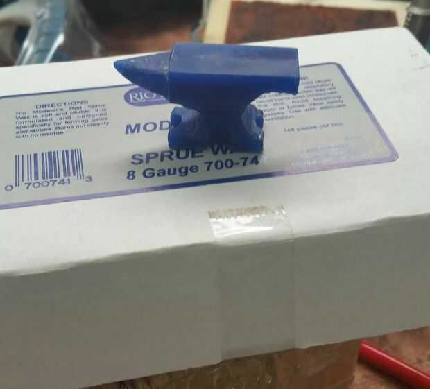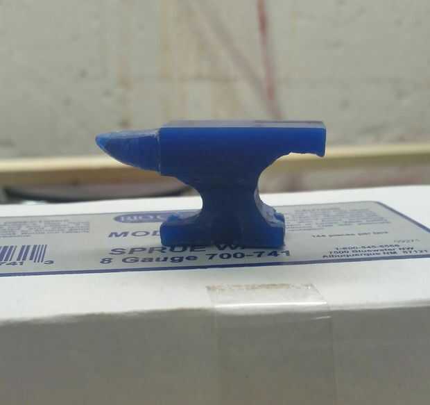 Uno de los principales inconvenientes para usar arcilla Delft y otras arenas de fundición, es que no puedes lanzar un objeto con entalladuras en un molde de dos partes típicas. por suerte para mí, yo quería un yunque que no tiene todos los socavados por el lado del molde. El yunque azul sobre fue tallado fuera de densidad media talla de cera. El material del modelo están siendo lanzado es importante porque va a tener que soportar una cantidad considerable de presión. digamos que su talla de favorito o esculpir el medio es algo suave como cera muy blanda o malvavisco, antes de continuar con el siguiente paso debe dar primero una versión resina dura. Una vez que un objeto duro que cree que vale el bastidor, puede proceder al siguiente paso.