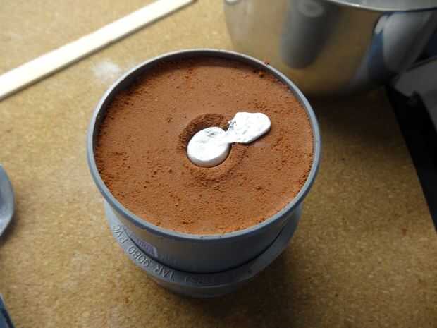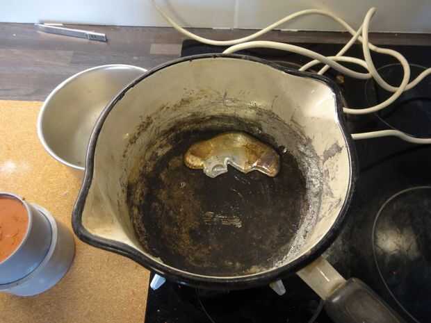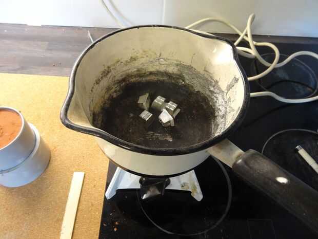 La temperatura de fusión del estaño es 230 grados centígrados. A 10 minutos en mi estufa se derritió el estaño. Puede quitar la película sucia en la bandeja con una espátula de madera. Y use una cuchara para revolver la olla, si es necesario. Cuando el estaño fundido es bueno puede comenzar colado directamente en el calor.