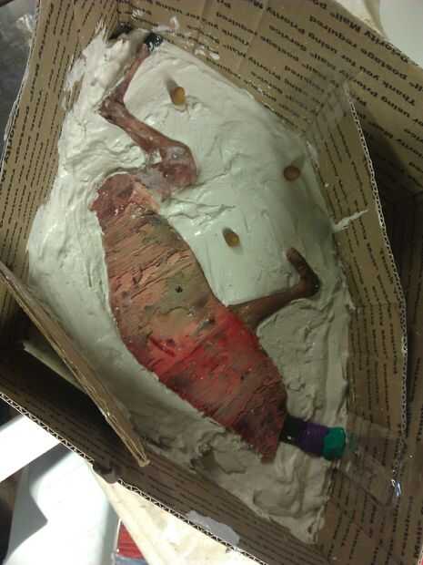 Aquí he hecho una "cama" de yeso 2-3cm espesor y suavemente empujó una mitad del zorro en él y el yeso un poco alrededor de los bordes de más – pies, vientre etc.. Las teclas de plastilina en este punto había ya tomado, pero se pueden ver los agujeros donde estaban. Una vez el yeso en la parte inferior empuje un poco de abrigo alegre en los agujeros, así que rodea los bordes, pero no es embalaje completo. Generalmente mentir un poco sobre el agujero y empujar con un lápiz, solo que algunos en el exterior y una capa. Este encuentro ayuda a liberación la capa superior de la parte inferior una vez que ambos, porque es difícil conseguir una buena capa de vaselina en los orificios. La plastilina en la cabeza cortada es donde mi agujero Vierta la espuma, y la plastilina en la pierna más baja que los dedos del pie deben ser donde se colocará el hilo o la varilla roscada. El bulto al azar verde es un espacio para ayudar a quitar el molde abierto.