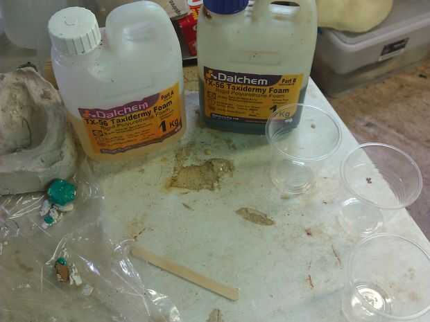 Ahora en la divertida parte. Haz tu espuma, lo que uso es de Dalchem, usted puede ordenar desde su página web y está basados en Victoria. Resulta que esto es cosas exigentes. En días fríos me calor ambas botellas en un cubo de agua tibia/caliente y poner a ambos lados de los moldes de yeso en frente de una estufa por un tiempo para conseguir que "kick" correctamente. Cuando estas cosas funciona es fantástico sin embargo! Si usted quiere una espuma más dura, la mezcla 1.1 con el oscuro líquido el líquido blanco.