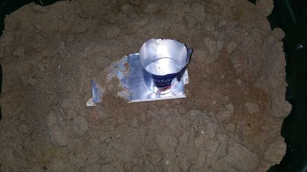 Después de la limpieza de los moldes entierre en un recipiente grande con arena. Utilizo latas pop cut-up para cubrir las aberturas para asegurarse de que no conseguirá ninguna arena dentro del molde. Estos trozos delgados de aluminio fácilmente se queman apartes cuando el aluminio derretido hace contacto con él. Me aseguro de que la arena está húmeda pero no demasiado mojado, quiere que pegan al embalarlo abajo, cuando se trabaja con aluminio fundido no quiero nada que mojado puede ser una situación peligrosa donde el agua se convierte a vapor muy rápido y puede causar golpe dorso y pequeñas explosiones. Esta arena es para asegurarse de que las pequeñas grietas en los moldes no soplar abiertas y escape de aluminio fundido en el suelo, y también soporta y protege los moldes para que no enfríen demasiado rápido.