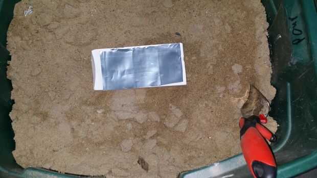 Así que primero hacer una buena base plana de arena para los moldes en, pondré a continuación las piezas planas de aluminio sobre la parte superior de los moldes para que accidentalmente no pala arena en ellos. Luego lentamente ir una pequeña pala de jardín rodean todo con arena. Puede soplar los trozos pequeños de arena fuera del camino si usted necesita a sólo necesita tenga cuidado de no entrar demasiado en allí. Dejar todas las piezas de aluminio y la ronda de pop puede en la arena todo el tiempo, puede verter el aluminio derecho en él y yo no he notado problemas.