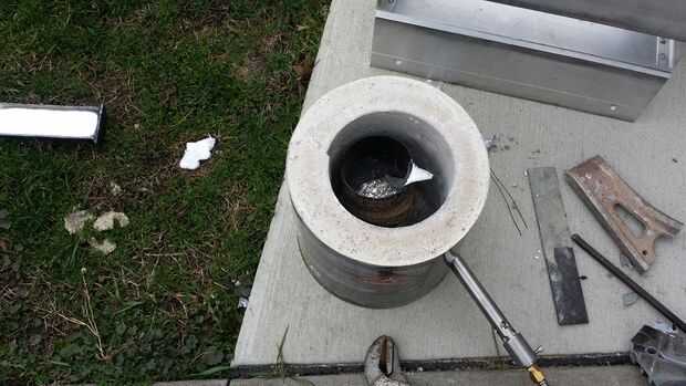 Voy a añadir aquí, un aviso de seguridad si no ha trabajado en metal fundido antes por favor, hacen algunas investigaciones primero porque posiblemente no puedo toco en todos los peligros de esta. Obviamente es muy caliente y metal líquido pueda entrar en algunos lugares extraños si se derraman. Así que por favor hacer esto fuera y botas de cuero punta de acero y no visible como una careta de piel desnuda.