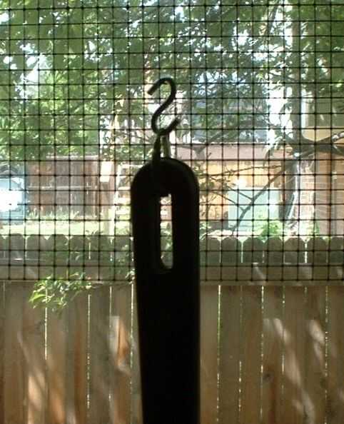 Una vez que la tela metálica es asegurada a través de su ventana, pega unos ganchos de S allí para colgar ollas y sartenes, guantes, utensilios y cualquier otra cosa se puede colgar de un gancho.