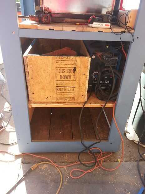 A continuación construí una repisa para poner mi soldador bajo el cepillo. Esto es sólo un pedazo de OSB en la parte superior cuatro puestos uno en cada esquina. Luego construí una casilla al ajuste al ajuste el soldador que es donde vive mi material soldadura, (mascarilla, amoladora, guantes, etc.). Os adjunto mi abrazaderas en un lado de la cepilladora. Usando la misma estructura como la bandeja inferior puse uno sobre el cepillo. En este momento mi gato y mi gato están en la parte inferior y en el estante superior es en su mayoría de motosierras.
