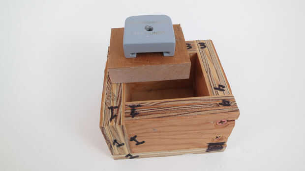 Creé y utilizará una reutilizable 3/4" madera contrachapada caja de moldeo que voy a utilizar para verter la silicona sobre la pieza para hacer el molde de dos partes. También es necesario un bloque espaciador 1/2' - 3/4" para levantar la pieza a la altura correcta en el cuadro. Hice esto de un trozo de madera, cualquier material suave se puede utilizar para esto. Por último pero no menos usé algunos GI 1100 silicona de innovadores polímeros Inc. un tanque de vacío y una taza de mezcla con cerca de tres veces el volumen de la silicona que necesito. Un poco más adelante explicaré el motivo. Ya que es una caja de molde reutilizable los lados están marcados por lo que puedo volver a montar la caja de moldeo del mismo modo en el futuro luego lo desarma y utilizarlo de nuevo.