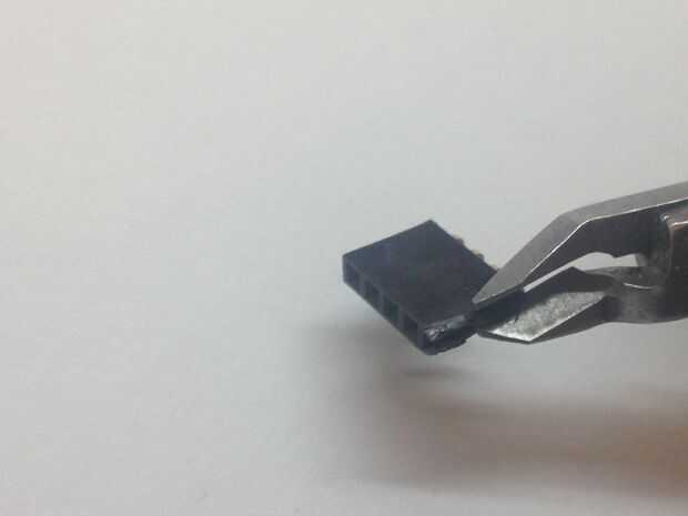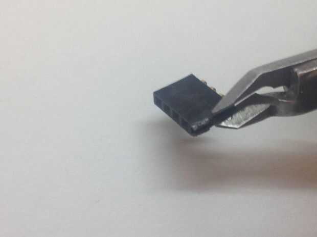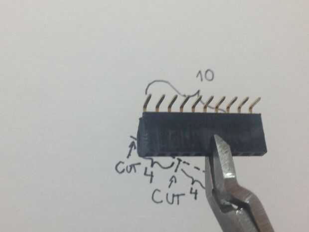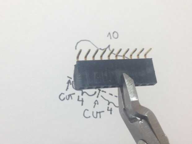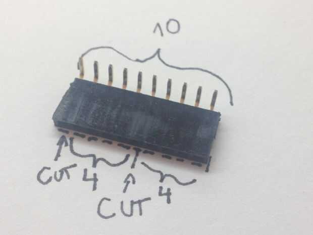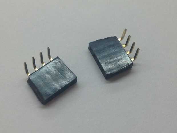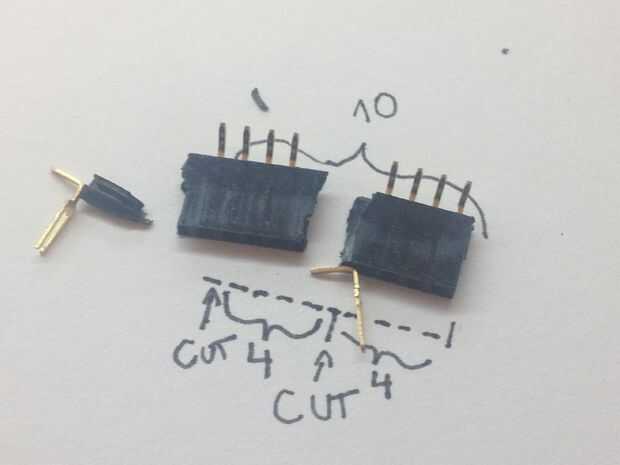 Tenemos que hacer dos versiones de 4 pines de pines hembra angular por lo que debemos cortar. No es posible cortar entre las clavijas así que siempre tenemos que cortar en el medio otro pin. Medir correctamente y comprobar las fotos! Cuando tienes el corte de 4 pines de plástico restantes para asegurarse las cabeceras iría muy bien en el plástico de la carcasa más adelante.