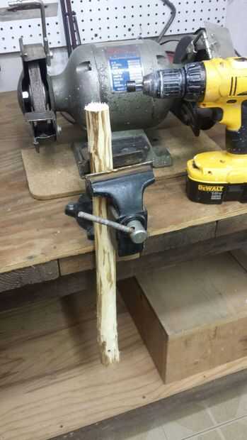 Ahora uno de los palillos con un vicio asegurado. ADVERTENCIA: Asegúrese de que no se va a deslizar. Esto puede ser peligroso. También asegúrese de que usted tiene una mano firme y no empuje hacia abajo a dura en la madera. Tómese su tiempo y perfore el agujero. Asegurándose de que taladre el agujero recto o cosas no alinean derecha.