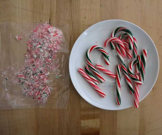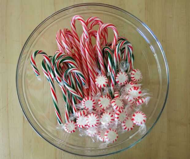 - Pedacitos de bastón de caramelo (caramelo de menta) - bastones de caramelo son frágiles, por lo que algunos se romperán inevitablemente mientras usted desenvolverles para este proyecto, guardar los trocitos rotos y aplastar a utilizar para la decoración de los bastones de caramelo.