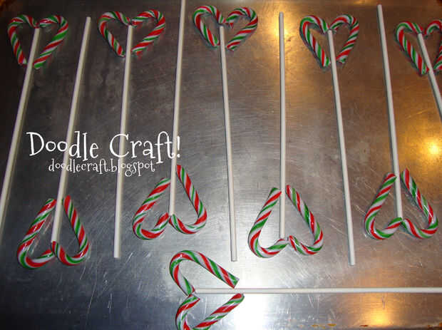 Arreglar las cañas sin envolver en forma de corazón con el palillo en el centro. Cocer en horno a 350 * por unos 2 minutos. Los bastones ablandan lo suficiente como para que les apriete juntos!