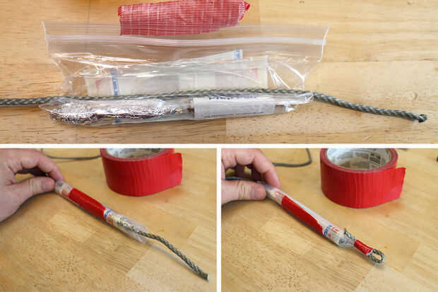 Un pedazo largo de paracord se colocó encima de la bolsa de plástico y las bolsas de plástico enrolladas firmemente y selladas con cinta adhesiva. Al final de la paracord fue grabado en lugar tan anclado a la bolsa.