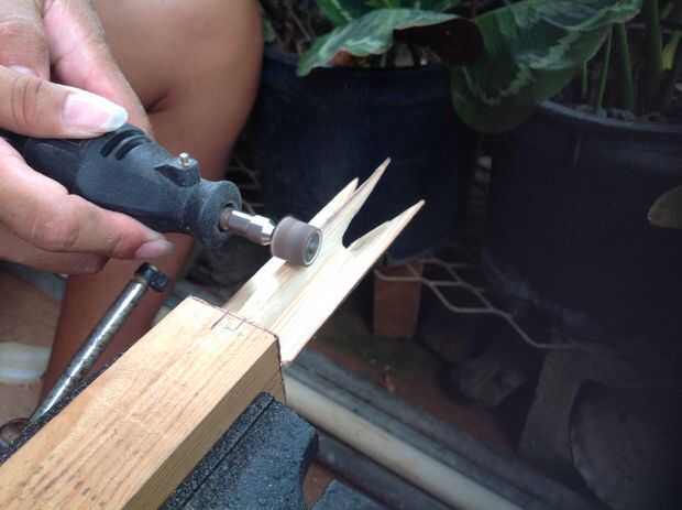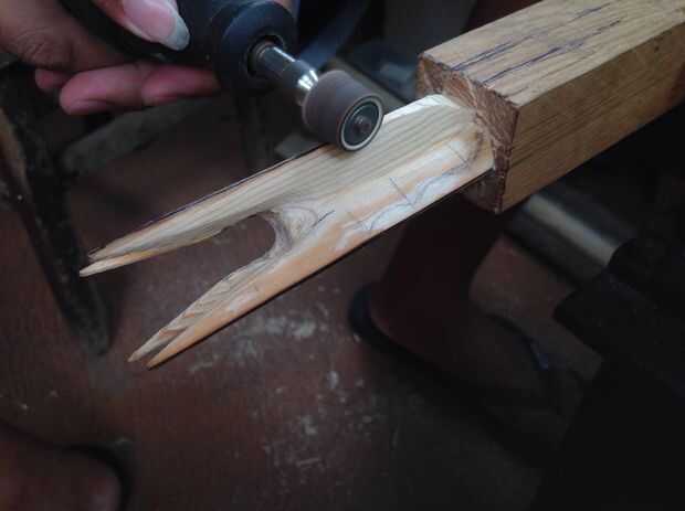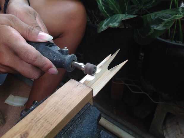 La forma que usted dibujó en el paso diez en la madera será un esquema donde a tallar. Usando el bisturí y Dremel, tallar la forma siguiendo la línea y tratar de hacer tan agradable como sea posible.