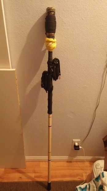 Lo que hice entonces fue medido en incrementos de 1 pie de la parte inferior de la punta de goma y pone un anillo de sharpie negro alrededor de la palanca. Me las arreglé para poner 3 anillos. Hice esto, por lo que si me encontré con agua turbia que absolutamente tenía que cruzar, podría tratar a profundidad fue! Bien, después se armó el palo entero, era más alto que yo estaba! Así que cortar y ahora tienen marcas más oscuro y el espesor a medir cada pie. Puedo ver 2, y que es lo suficientemente bueno para mí. Yo también envuelta la parte inferior con unos pies de cinta gorila para mantener la parte inferior del palo de la división, en caso de tornillo del gancho en demasiado!