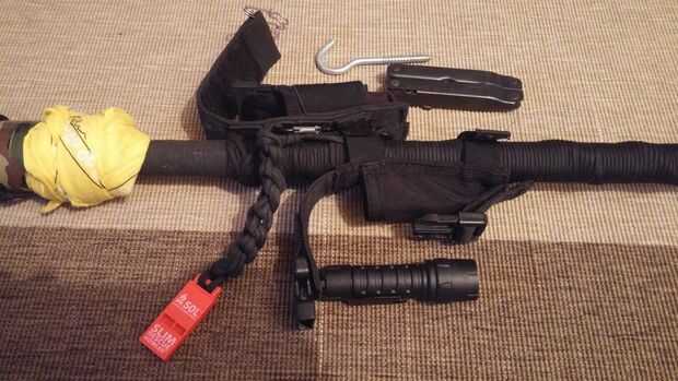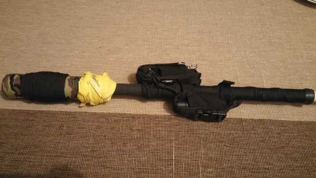 Así que necesitaba agregar almacenamiento de información para las herramientas que podría utilizar en los senderos. Desde palos carecen de cualquier tipo de almacenamiento interno, tienes que averiguar una manera de añadir espacio de almacenamiento en el exterior! Decidí matar 2 pájaros de 1 tiro. He añadido algunas cintas de agarre a la parte superior que funciona muy bien para evitar que accidentalmente dejando caer su bastón. Justo debajo de eso, empecé a envolver paracord y tejió a través de la correa del molle en mi envoltura de Leatherman MUT. Yo seguí envolviendo hasta de paracord. Esto me dio un apretón amplia agradable cuando se utiliza junto con la cinta de agarre por la parte superior. ¿Perfecto para, digamos... una caña de pescar improvisada? ;)