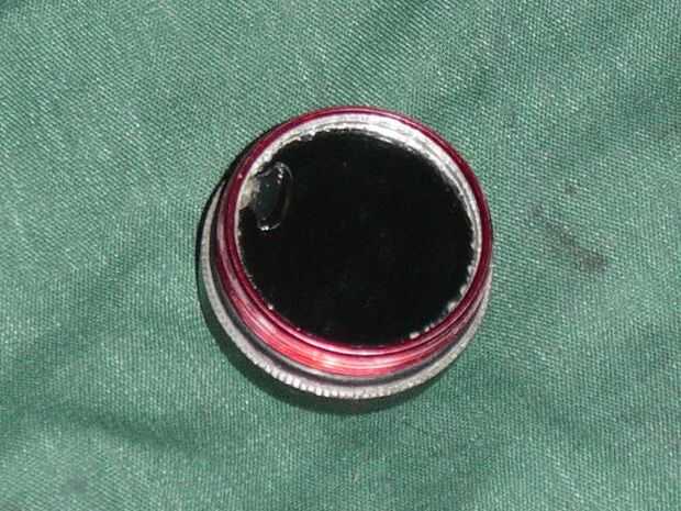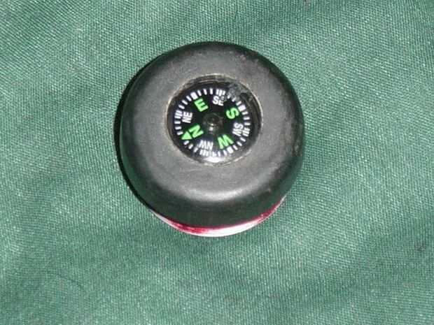 en el agujero. Mezclar un poco pequeño de epoxy y aplicarlo al borde exterior de la brújula y en el interior del agujero, luego coloque la brújula en el orificio y asegúrese de que la brújula encuentra al ras en la tapa. Déjelo durante unos 5 minutos y compruebe para asegurarse de que no se movió. Mezclar algunos epoxy más y aplicar en el interior de la tapa hasta el la parte posterior entera de la brújula está cubierta y es agradable y plana. Permiten unas 5 horas para fijar para arriba y firme hasta. Cortar una pieza de 1" espiga de 3/8"-1/2" de largo que es tiempo suficiente para que el pasador quedar al ras con el borde interior de la tapa, luego mezclar algunos epoxy más y colocarlo en el interior de la tapa encima de la otra epoxy y coloque el pasador en el orificio con un ligero movimiento de torsión. A continuación aplicar algunos epoxy más la espiga y un poco en el labio interno de la tapa y coloque el espejo en la tapa y suavemente presione hacia abajo y gírela. Colóquelo en algún lugar seguro y deje que se cure completamente. Puede utilizar el espejo como un espejo de la señal.