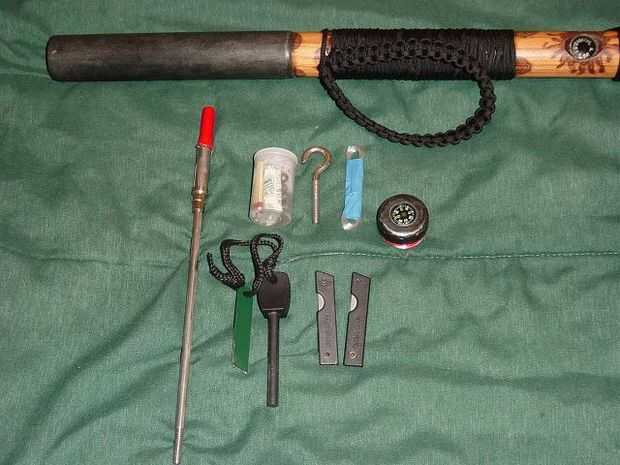 Este paso o uso justo una Fuji Film transparente bote y cabe perfectamente dentro del tubo de mag D-cell) ahora toma el bambú y asegúrese de que cabe cómodamente en el recipiente. Si no cabe su y arena hacia abajo hasta que encajen. Coloque la lanza de pescado en el agujero y luego medir desde la parte inferior del contenedor en la parte superior de la lanza de peces para ver hasta qué punto se pega fuera del agujero y luego agregar 1/4". Uso que medida a la medida desde la articulación de la pieza de bambú y haga una marca, luego cortarla ahí. Siguiente parte es donde se pone complicado. Medir desde la parte inferior del contenedor en el interior de la parte inferior de las roscas y luego restar 1/2", entonces utilizar esa medida para hacer una marca en el otro extremo del bambú desde su último corte, luego cortar esa sección. Usted puede hacer una tapa de una pieza de espuma o si eres mañoso lo suficiente puede hacer uno de una clavija de madera de 1.25" y hacerla encajar firmemente en bambú y todavía tienen un casquillo superpuesto. La sección tapada es donde colocar tu equipo de supervivencia. Ahora usted puede resbalar en el recipiente y la tapa de rosca. Si la tapa no Atornille completamente puede pulir el bambú o la tapa de bambú hasta que recibe la tapa de atornillar pero no desea que se ajuste muy apretado o corre el riesgo de epoxy separa el recipiente y deje que el agua y la humedad se escape en el contenedor. Sugiero hacer cabe cómodamente y luego lo lijado hacia abajo un poco más a donde confunde un poco. Para mi kit de supervivencia tengo algunos partidos, curitas, anzuelos, plomos de pesca y pelusa de secadora en el cartucho de película y en el resto del tubo que tengo el gancho del gancho agarrador, pescado lanza, par de maquinilla de afeitar, cuchillos de pesca línea y fuego acero. Todo ello se ajusta firmemente en el tubo. Y ahora se hacen y tiene un bastón de supervivencia!