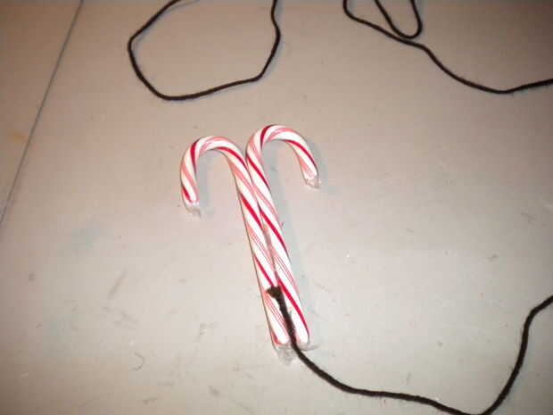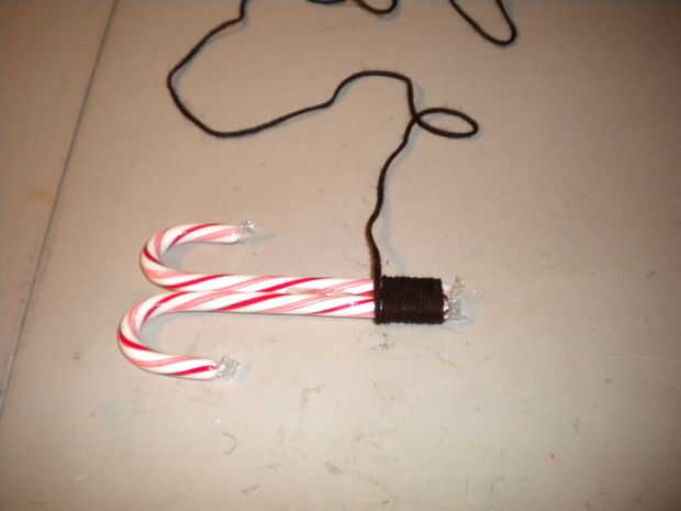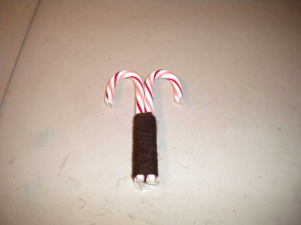 Ahora, usted tendrá que agregar hilo marrón para el bastón de caramelo.  Comience usando pegamento caliente para unir una pieza de maneras largas de hilo en la parte posterior de la caña de azúcar.  Una vez que este seca, comenzar a envolver el bastón de caramelo y continuar hasta que ha envuelto a la altura que quieres para tus renos.  Cuando se envuelve totalmente, utilizas un poco de pegamento caliente para fijar el hilo en la parte posterior de la caña de azúcar.