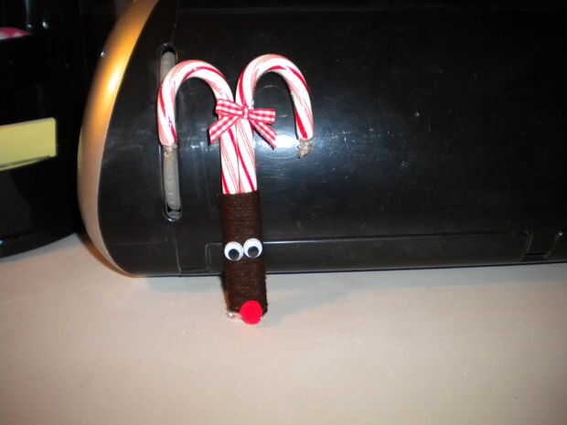 Para finalizar su Reno, está listo para agregar los datos.  Caliente se pega unos ojos de google, una bola de pom pom para la nariz y una cinta, lazo o lo que sea le gustaría arreglar su Reno.