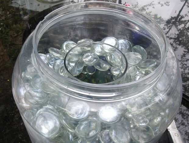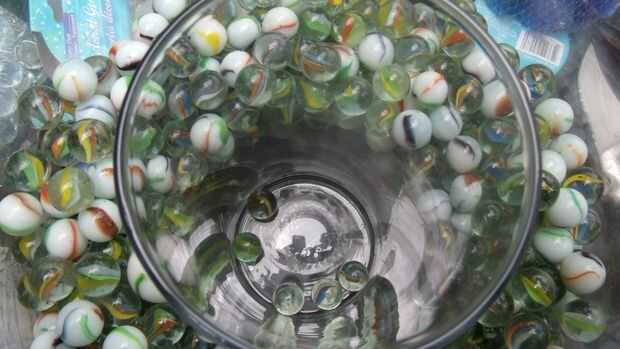 El cilindro de cristal no deja mucho espacio para las manos grandes sosteniendo un montón de canicas, me caer canicas por todo el lugar hasta que puso en un bolso de compras plástico, arrancó de una esquina y VIOLA, los mármoles fueron donde yo quería muy fácilmente! Luego añadí las gotas de vidrio. Necesito un par más dólares para llenar el conatiner
