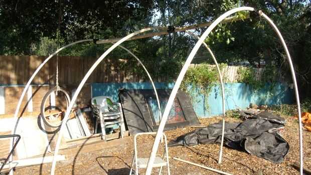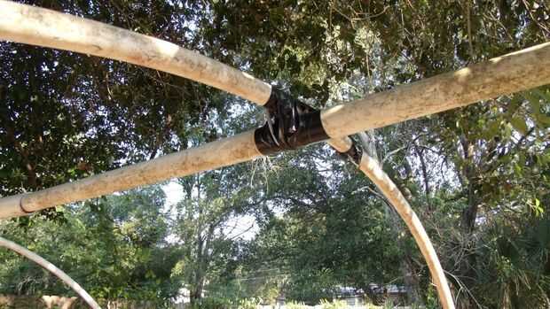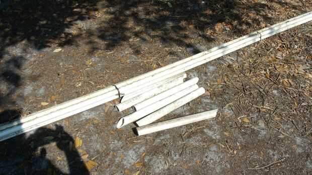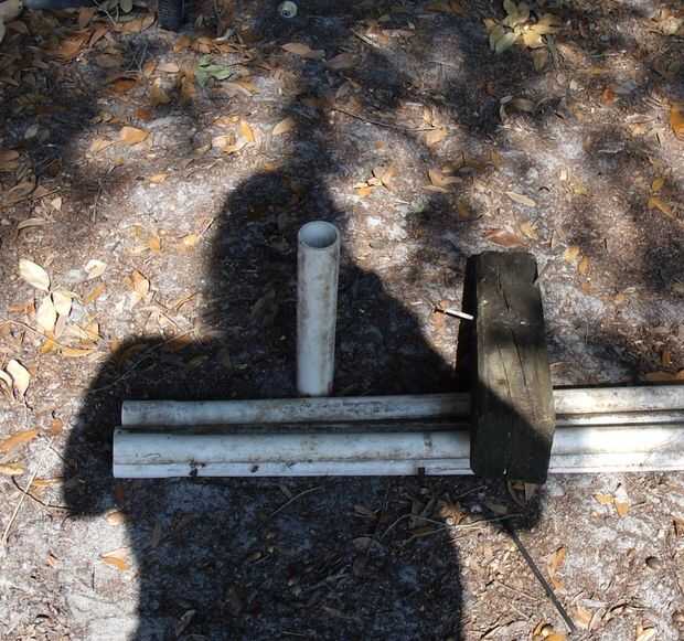 corté un par de espigas de arena desde el tubo de 2" a 20" de largo (un pico de arena normalmente es usado por los pescadores de surf para sostener sus cañas de pescar, es un pedazo de tubo plástico con un extremo cortado en un ángulo y, en ocasiones, una ranura para el carrete) entonces manejé los "picos" en la tierra. (La próxima vez necesito recordar medir y usar una regla recta!) Luego coloqué las longitudes de tubería de 1" en los"picos"a los aros de forma. No quería cortar el tubo o ir a buscar piezas de conexión, así que cogí algunas piezas impares y pato con cinta como soporte
