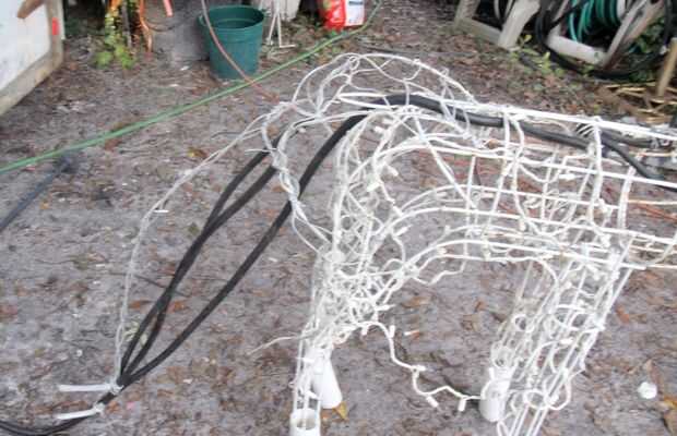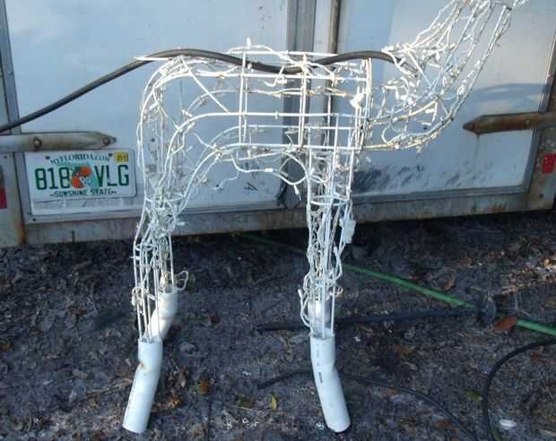 Primero quería un poco más alto y una curva extra en las piernas así que cortar unos 12" secciones de pvc que se deslizó sobre las piernas, calienta con una pistola de calor y lo dobló. Me resbaló las extensiones en y añadido algunos pegamento caliente para mantenerlos temporalmente en el lugar. Uno de los renos tenía un cuello inmóvil y uno tenía un cuello más recto móvil, sólo tuve que doblar un alambre para mate 2 cuello y cabezas pero ahora era pesado frontal! OK tiempo añadir una cola, usé sobre 7' pedazo de aluminio eléctrico cable para formar la parte superior de la cola y corrió dentro del cuerpo, un par de piezas más cortas los lados. Luego tomó algunos pedazos de alambre y extendido las ancas y conectado todo junto