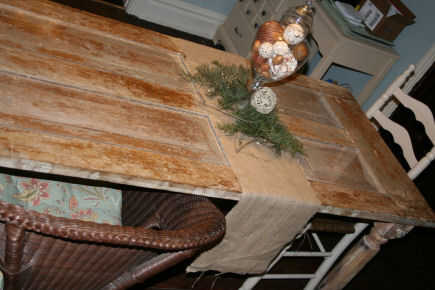 En la niebla de mis viajes diarios, me di cuenta al lado de la carretera una puerta vieja, en un montón de basura. (Sí que me encanta recoger basura) Trajo a mi garaje y tiene derecho al trabajo! Me puse la puerta plegable patas así que fue de la tierra. Usé una lijadora eléctrica de mano para obtener las primera capas par de pintura. (Era mucho trabajo). Una vez me puse a casi su primera capa de pintura y madera original, entonces comencé a chip algunos de la pintura para darle un aspecto rústico, shabby chic. Entonces una vez yo estaba feliz con la mirada, yo entonces enarenó ligeramente lo a mano. Una vez que era agradable y suave puse una capa de poliéster mancha en la puerta. En el otro lado de la puerta me lijar con una lijadora eléctrica y poner poliester mancha, (esa forma cuando usted sentado en su mesa las piernas no roce algo fuerte).