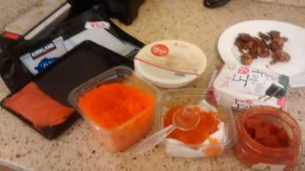 En nuestro caso, nos habían algunas sobras fumado trozos de salmón, unos restos de pollo, algunos pescados huevos, algunos pickles de kimchi, algunos perros calientes (no en la foto). En caso de que usted se está preguntando, kimchi y hot dogs es una combinación sorprendentemente buena. Nota: Si no tienes una madre de perla cuchara para su caviar, una cuchara de plástico funciona igual de bien