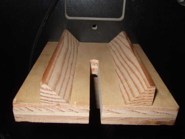 La placa trasera está hecha de madera contrachapada de 3/4". Los carriles de 45 grados se cortan de madera dura 3/4". (En retrospectiva, mirando los anillos de crecimiento, estoy bastante seguro de que los rieles son de madera blanda. Creo que es cedro.) Usé una sierra para cortar el bisel de 45 grados en la placa frontal y rieles. A continuación, pegué los rieles a la placa trasera. Pero antes de que el pegamento seco, sujeta la placa frontal a la placa trasera con 3 tiras de papel entre los tableros como espaciador. Entonces sujeta los rieles hacia la otra, por lo que todo se alinee, apretado. Una vez seco, quité el papel. El pequeño espacio dejado por el documento asegura que los rieles se bloqueará uno contra el otro antes de que la placa de fondo totalmente hacia fuera. Cuando bloqueado, no hay absolutamente nada de juego en cualquier dirección. Luego perforé un agujero para el botón de bloqueo, aproximadamente en el centro, a través de ambas placas. Luego corté la ranura de la placa con una sierra de cinta (usando el orificio que perforé para saber donde debe alinearse el corte y el final). Luego pegué otro bloque de madera en la parte posterior de esta placa en un perfecto 90 grados, para dar una superficie más grande para la indexación contra la parte inferior de la tapa de tabla y mayor rigidez una vez montado. Luego dos agujeros se perforan a través de empernar a la mesa.