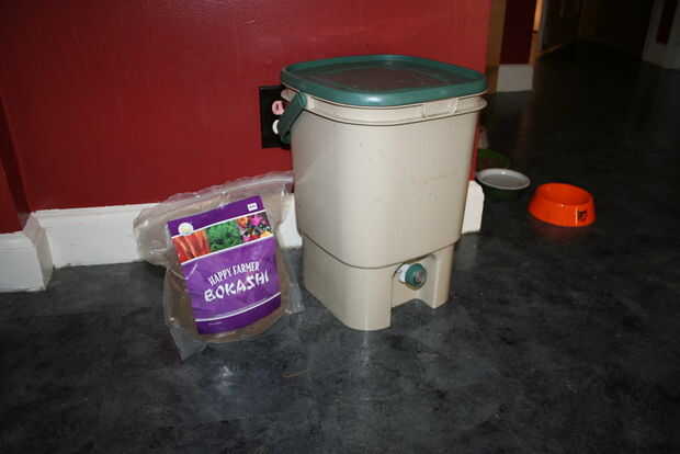 Cuando el contenedor superior de cocina completo, tirar su contenido el cubo granjero feliz y espolvorear sobre algunos Bokashi. Usted no necesita utilizar el bio fermentación ayuda pero prácticamente duplica la salida de jugo del cubo. Hay instrucciones en sitio del granjero feliz trata de hacer tu propio aditivo.