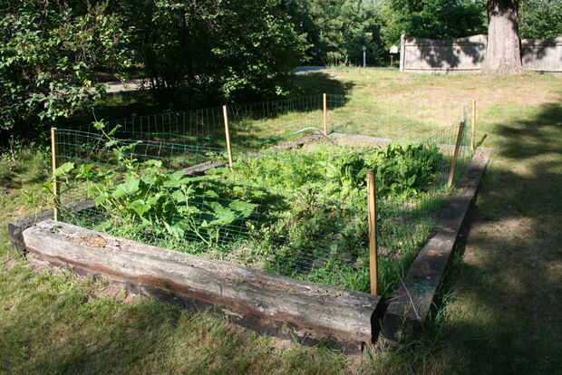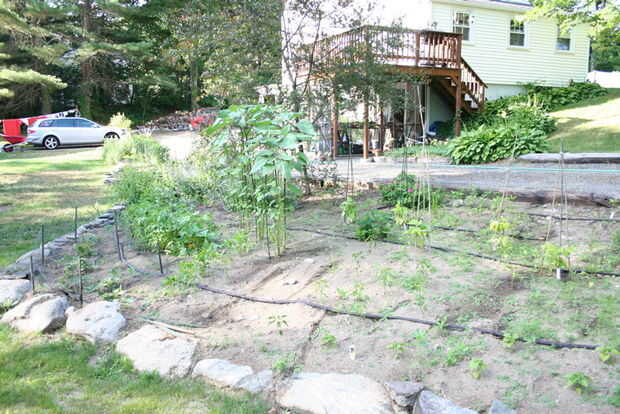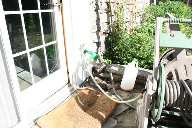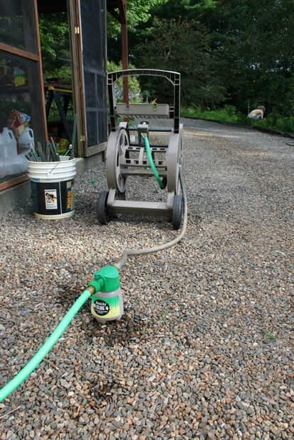 I re-purposed envase fertilización en línea de Miracle Grow y lleno de jugos de cocina sin diluir. Conectado a una manguera de riego, que es un tubo poroso que se establecen entre las plantas.