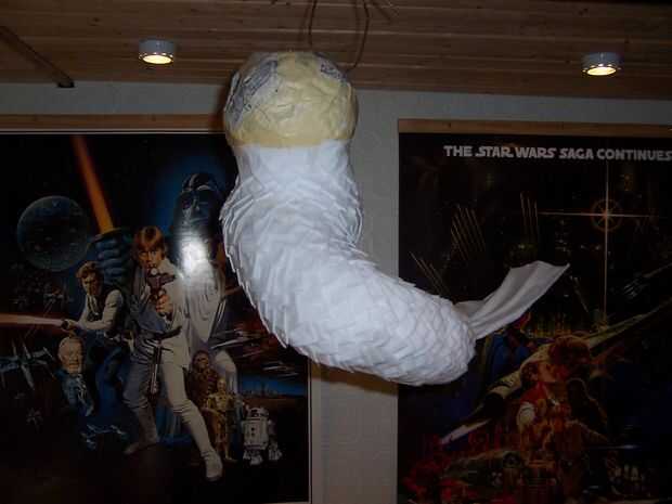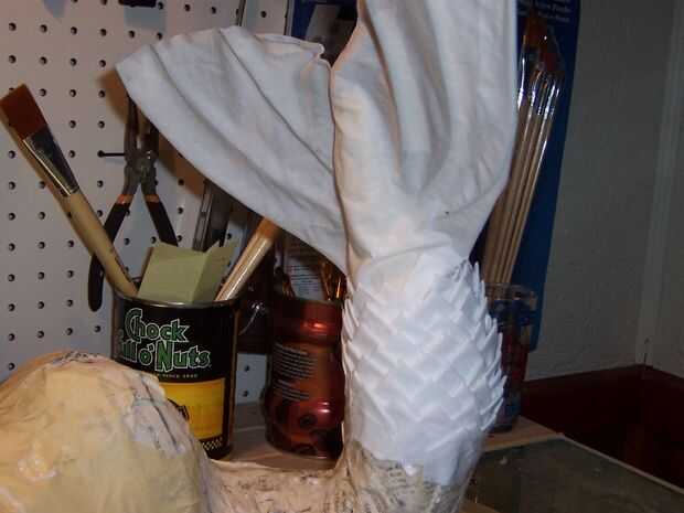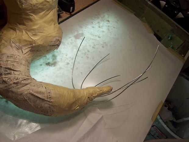 Para las escamas de la cola otra vez usé técnicas de Dan Reeder. Corté unas 150 plazas de 3cm hacia fuera de la vieja sábana. He preparado mi envase de pegamento blanco diluido y colgado el cuerpo de un alambre en el techo para que sea más fácil trabajar con. He empapado un puñado de plazas en el pegamento y exprimido hacia fuera tanto pegamento como sea posible. Cada escala es una sola plaza, con dos esquinas dobladas, para crear algo así como un triángulo. La escala se coloca en la cola con los pliegues hacia abajo a partir del extremo de la cola y trabajando hasta el torso. El pegamento residual tiene la escala en su lugar. Esto era muy lento y se realizó en tres sesiones, permitiendo algunas seque durante la noche y luego proceder al día siguiente.