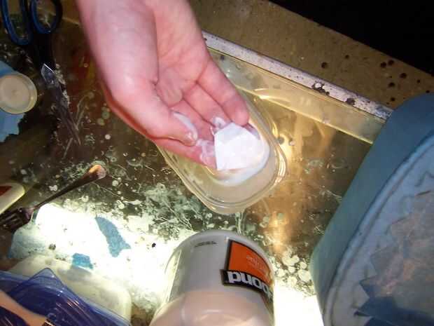 Para crear la cola de pescado utilicé trozos de perchas de alambre para crear el "esqueleto de la cola. Luego cubrí la cola con un pedazo de viejas sábanas empapadas en pegamento blanco diluido: corte un pedazo de hoja a tamaño y sumergido en un recipiente de pegamento blanco ligeramente diluido. He exprimido hacia fuera el exceso y puso cuidadosamente la ropa sobre el armazón de alambre. Empujé la ropa un poco con mi dedo entre cada trozo de alambre para crear un efecto realista. Dejo que este seque durante la noche. Una vez seco, recortado con unas tijeras para hacer la forma de la cola de pescado.