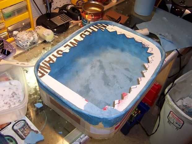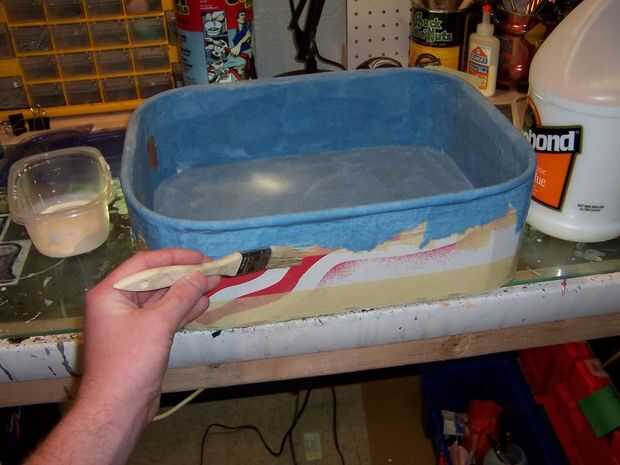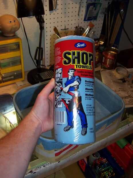 Una vez la segunda capa de papertowel secada rozó en una capa de pegamento blanco recto. Pegamento blanco diluido no funcionará aquí porque el agua hace que el papertowel a hincharse, potencialmente desfigurantes de la obra. Una vez seca esa capa, se aplicó un segundo de la misma manera. El pegamento actúa para sellar el papel y también llena en cualquier manchas irregulares. Las toallas de papel tienen una textura definida que no es deseada. El pegamento llena y hace suave.