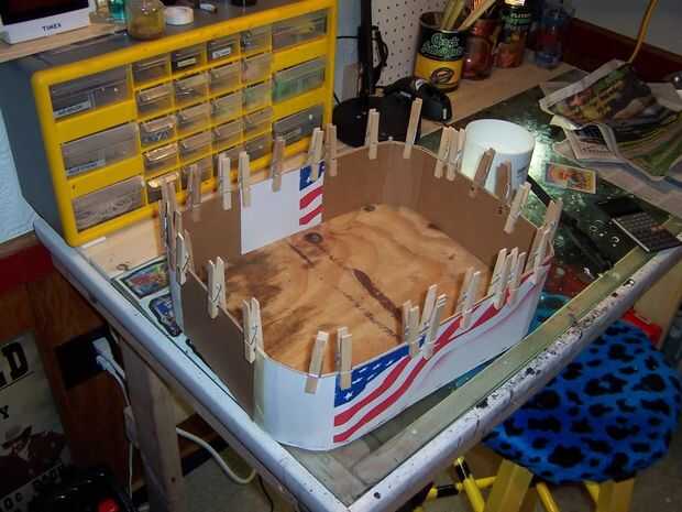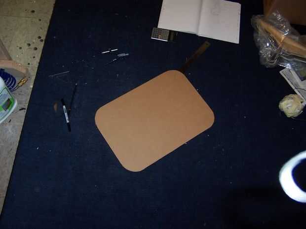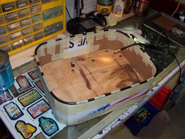 Utilicé un cartón más para formar las paredes de la lata de sardina. Hice una doble capa para crear un buen grosor (un montón de pegamento entre las capas) y adjunta las paredes a la madera contrachapada con un staplegun. Cubrí las grapas con cinta de enmascarar para que no causaría ninguna textura inusual después de papel maché-ing. Para crear el borde enrollado alrededor del borde de la sardina puedo utilizar una vieja sección del cable coaxial. Esta pegada al borde para sujetarlo hasta que se cubre con papel. En la ficha de Sally maloliente, la lata de sardina es abierto que crea una característica rasga-lejos en el interior de la can. Usé cartulina más para ello trazar el perímetro de la lata de sardina y un borde irregular. Este pedazo fue pegado y pegado en su lugar.