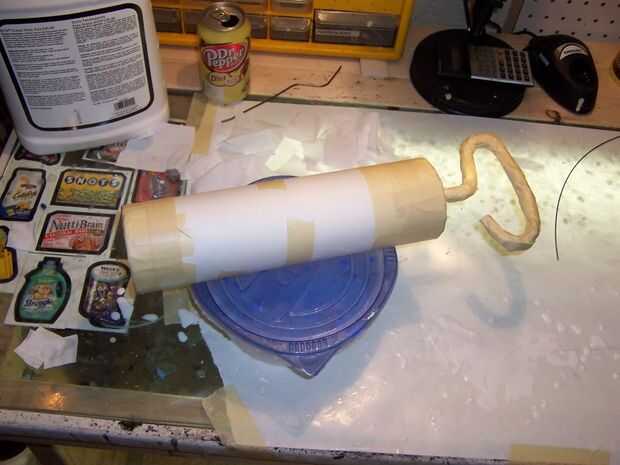 Para hacer el rollo utilicé un trozo de cartulina enrollada y grabado. Entonces usé más perchas de alambre para crear la clave. Cubrí el alambre con periódico y cinta. Cerré ambos extremos del rollo con un círculo de cartón e inserta la llave en un extremo por un agujero que corté. La clave fue pegada y sostenida por un montón de cintas. Ahora podía determinar la longitud de los brazos por el cuerpo de posicionamiento dentro de la lata de sardina y sostiene el rollo en su lugar.