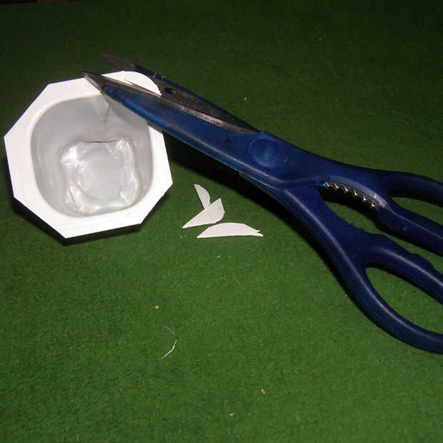 Yo también recortar los bordes de la mina para que se vean mejor, pero esto no es necesario. Estos envases de yogur vinieron en una bandeja de plástico equipada, pero no importa si no tienes. Haría una caja de cartón poco profunda, como la tapa de una caja de zapatos o el tipo de bandeja cartón latas pop a veces vienen en.