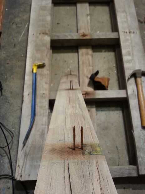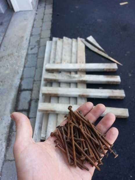 Desmontar el palet fue más difícil de lo esperado. No todas las paletas son creadas iguales; y la encontré era de adoquines y era muy pesado y construido al último. Pude desarmar todo y quitar las uñas en poco más de una hora, y arruiné un tablón. Terminé cortando la mayor parte de los extremos de los tablones, que fueron muy dañados de mis curiosos.